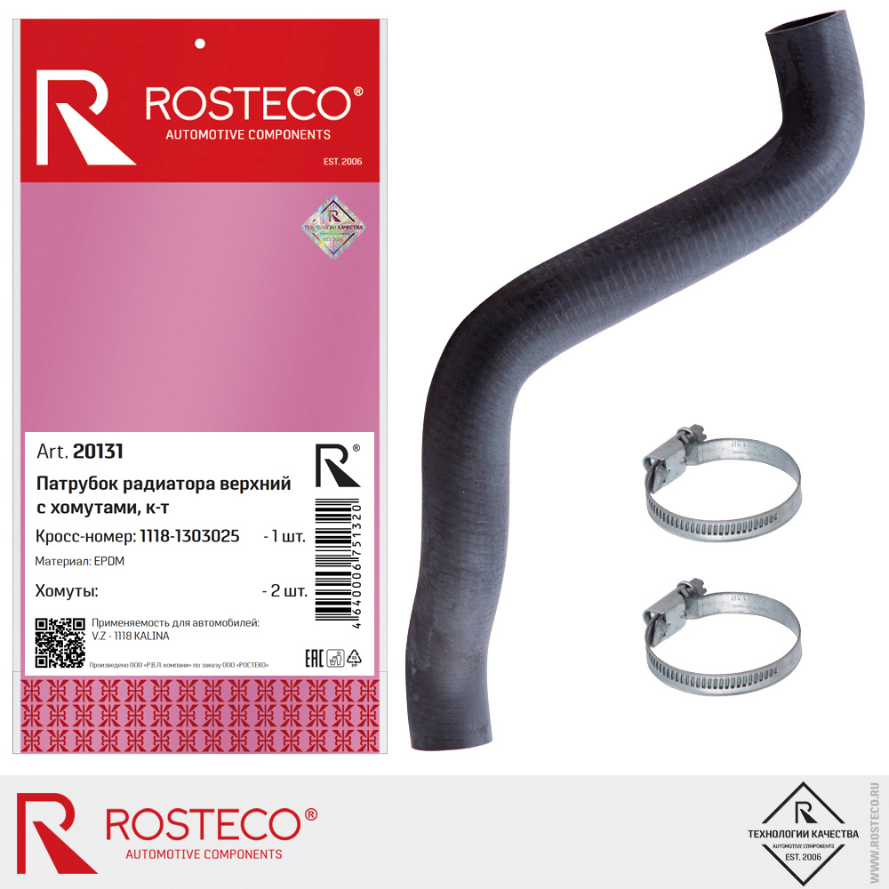 Наименование: Патрубок радиатора ВАЗ 1118, верхний, с хомутами. 1118-1303025 'ROSTECO'