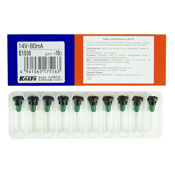 Наименование:E1535 KOITO Лампа дополнительного освещения 14V 80mA T4.2 - пластик. цоколь (зелёный)