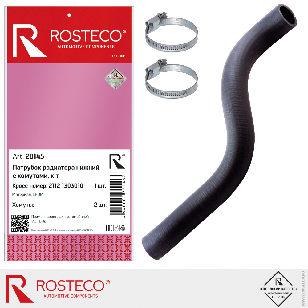 Наименование: Патрубок радиатора ВАЗ 2112, нижний, с хомутами. 2112-1303010 'ROSTECO'