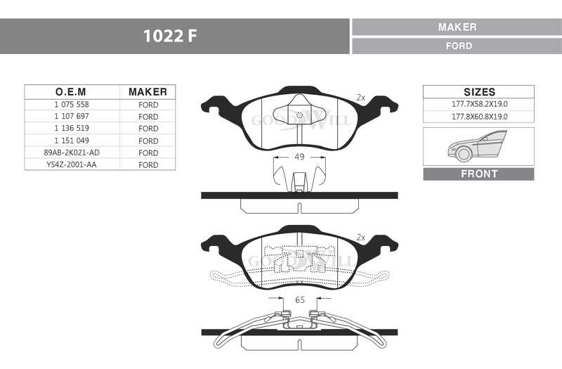 Наименование: Колодки тормозные передние GOODWILL арт.1022F