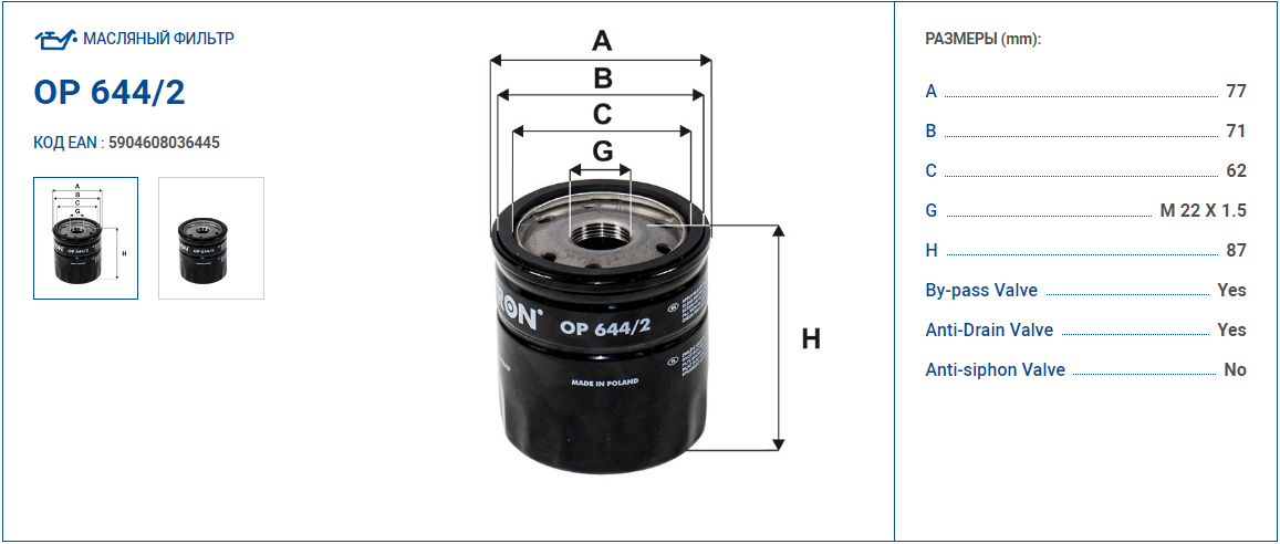Наименование:Фильтр масляный FILTRON OP644/2