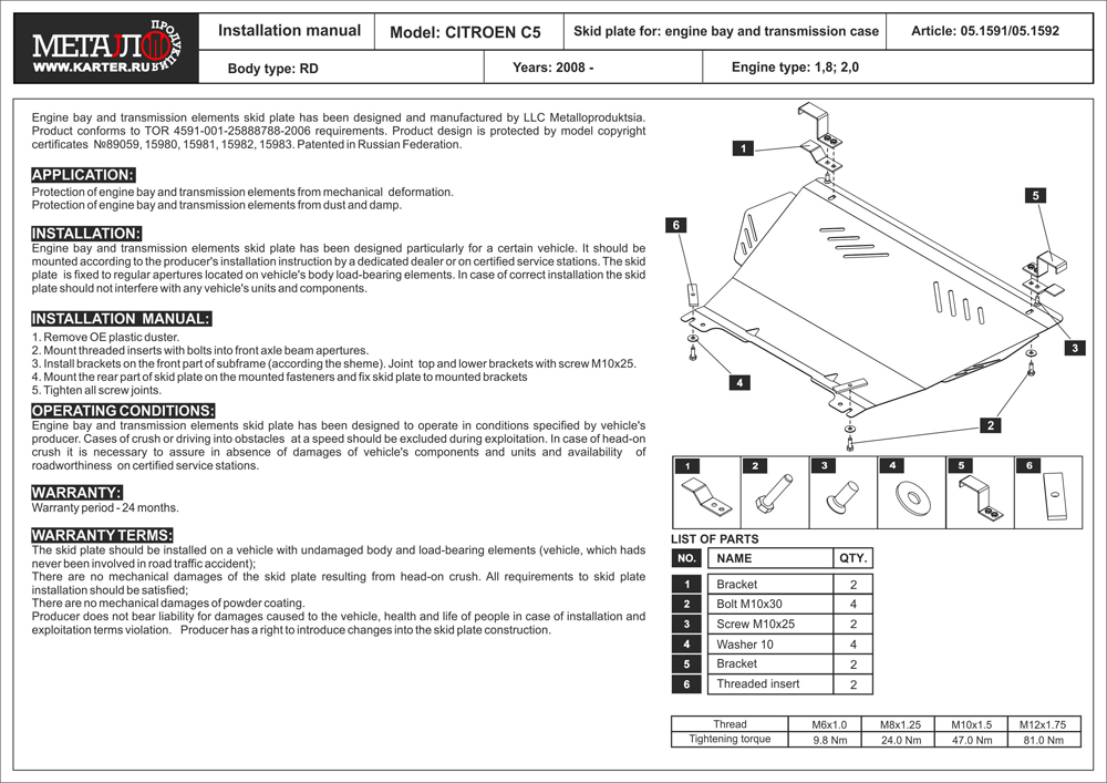 Наименование:Защита картера и КПП для CITROEN C5, 2 008-, , сталь 2,0 мм, CITROEN C5, 2 008-2 010, RD, сталь 2,0