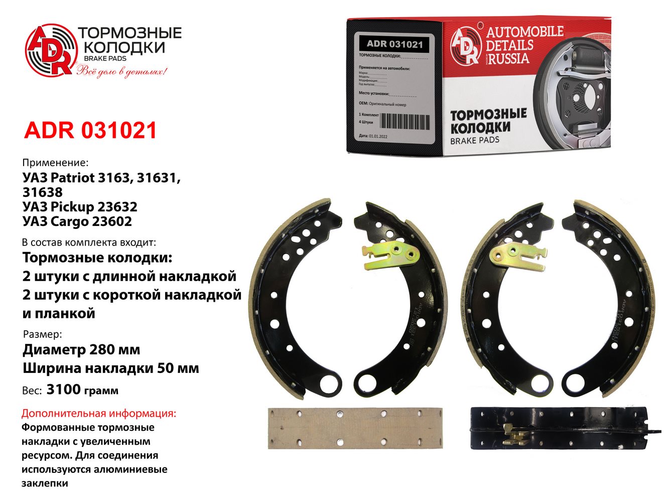 Наименование: колодка ADR UAZ Patriot с 2014г. задняя с планками OPTIMAL ADR031021 (OEM 3163 - 3502082)