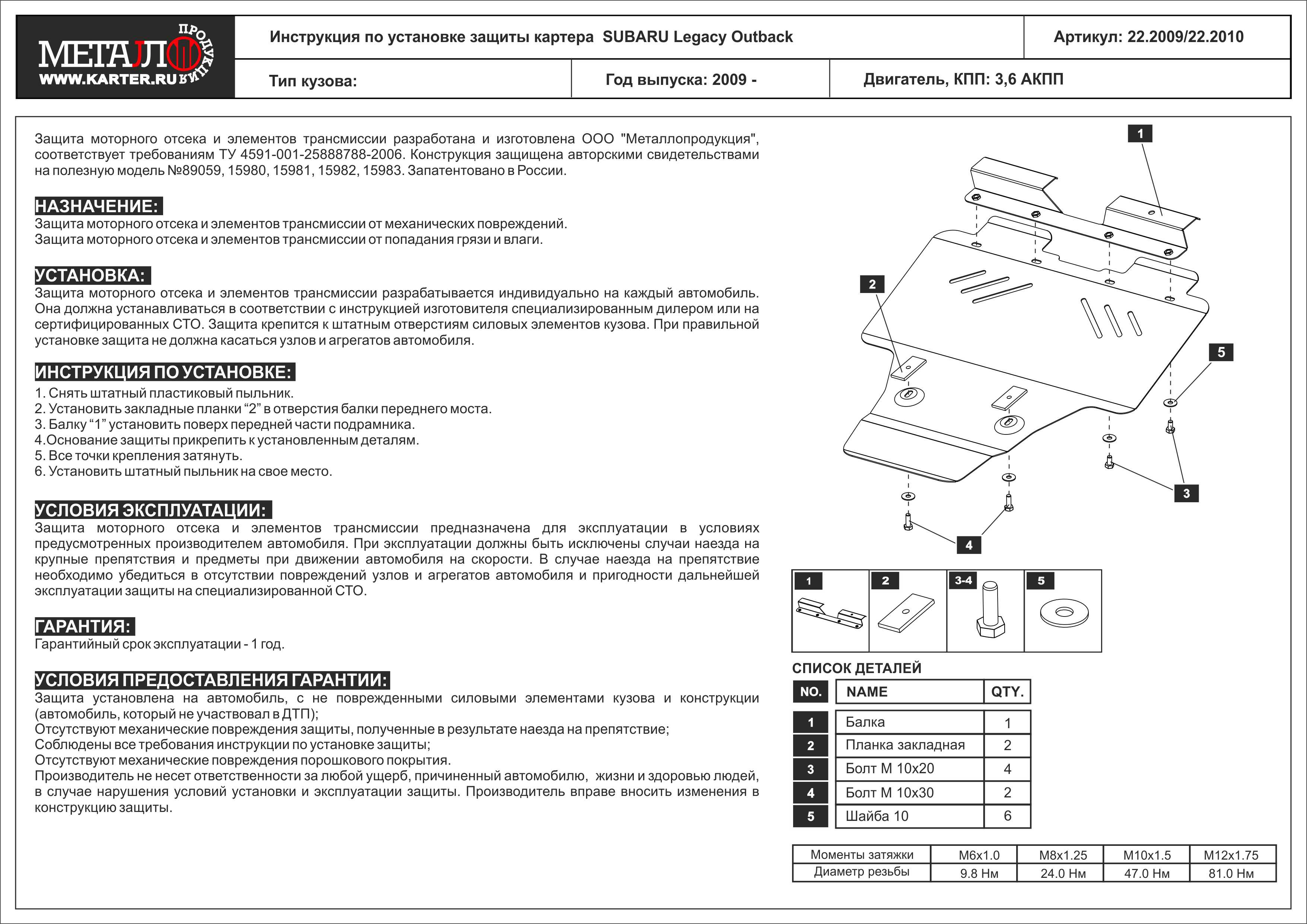 Наименование:Защита картера для SUBARU Outback , 2009 - 2015 , сталь 2,5 мм