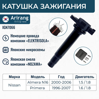 Наименование: Катушка зажигания Nissan Almera (N16) 00-, Primera (P11) 98-, Sunny 98-04 (QG13DE, QG15DE, QG18DE)