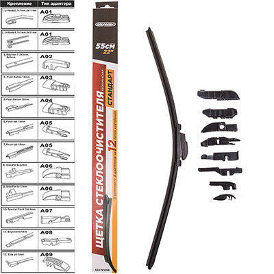 Наименование:Щетка стеклоочистителя бескаркасная SKYWAY AQUA BLADE 9 адаптеров в коробке 55см/22'