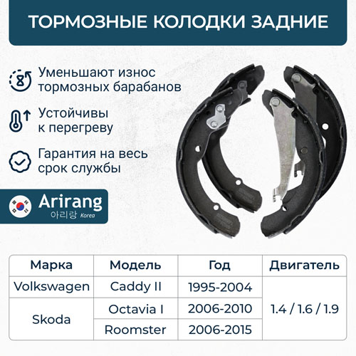Наименование: Колодки тормозные VAG Polo (RUS) (1KC) 10-, Jetta 10-, Octavia 96- Roomster 06- барабанные ARIRANG
