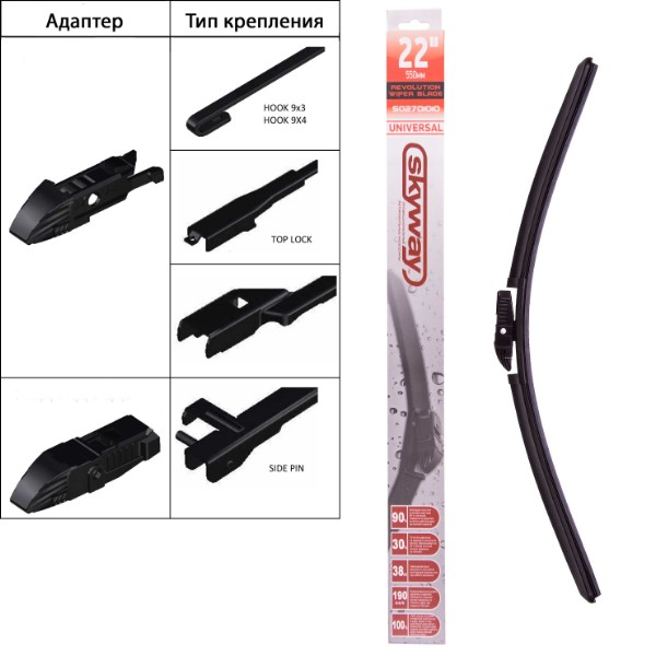 Наименование:Щетка стеклоочистителя бескаркасная SKYWAY универсальный адаптер в коробке 53см/21'