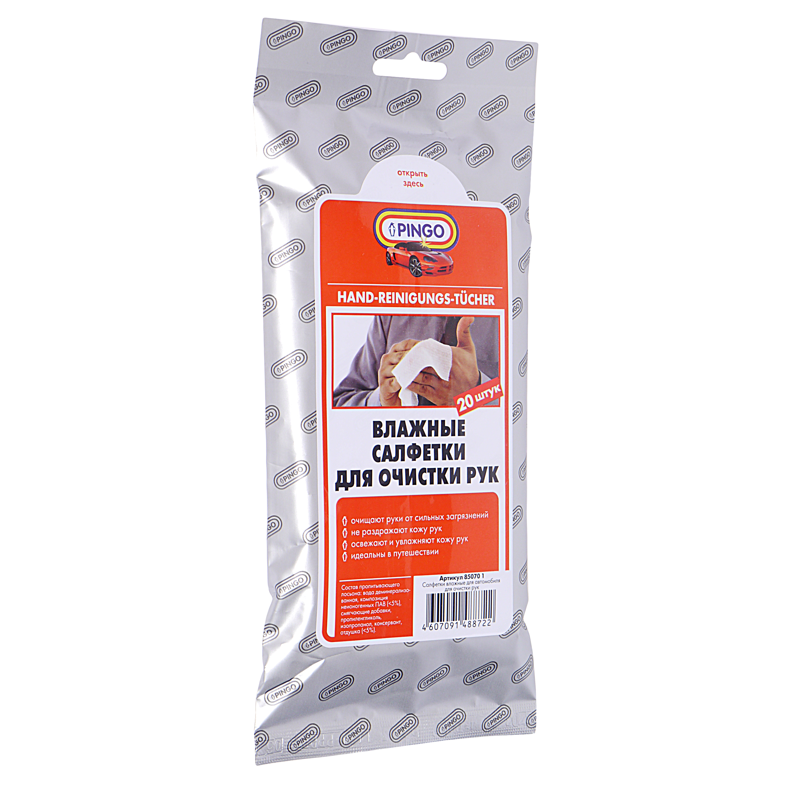 Наименование: Салфетка влажная для очистки рук 20x16см в мягкой упаковке 20шт. PINGO