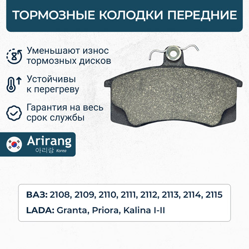 Наименование: Колодки тормозные передние LADA 2108-2115, Priora, Kalina I-II, Granta (Arirang ARG28-1607)