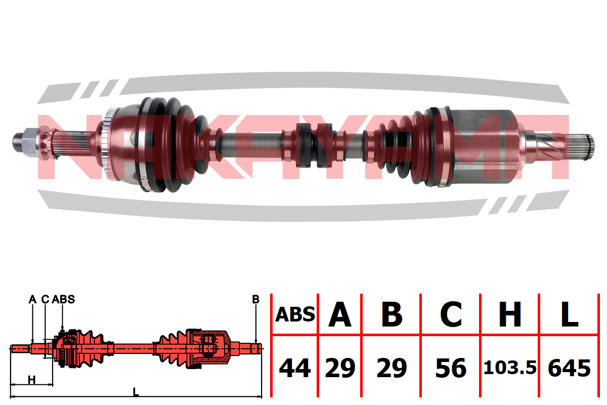 Вал приводной, перед. лев. NISSAN X-TRAIL (T30) 2.0/2.5 AT 01-13 (29x29x645x56 ABS:44)