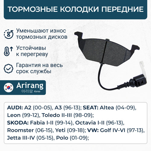 Наименование: Колодки тормозные VAG Golf 97-05, Polo (RUS), Fabia 99-, Octavia 96- передние ARIRANG (с датчиком)