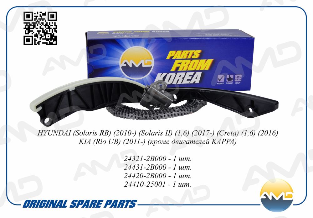 Наименование: Комплект цепи ГРМ (цепь + натяж + два успокоителя) HYUNDAI Solaris RB, 2010-, Solaris II, 1,6, 2017-, Creta, 1,6, 2016-, KIA Rio UB, 2011-, Rio IV, 1,6, 2017- AMDKITCS22