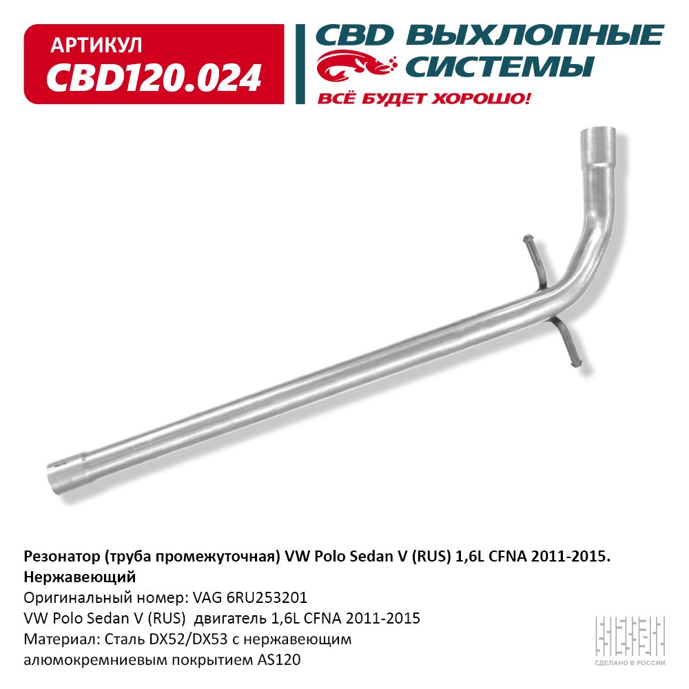 Наименование: Резонатор (труба промежуточная) VW Polo Sedan V (RUS) 1,6L CFNA 2011-2015. Нержавеющий. СBD120.024