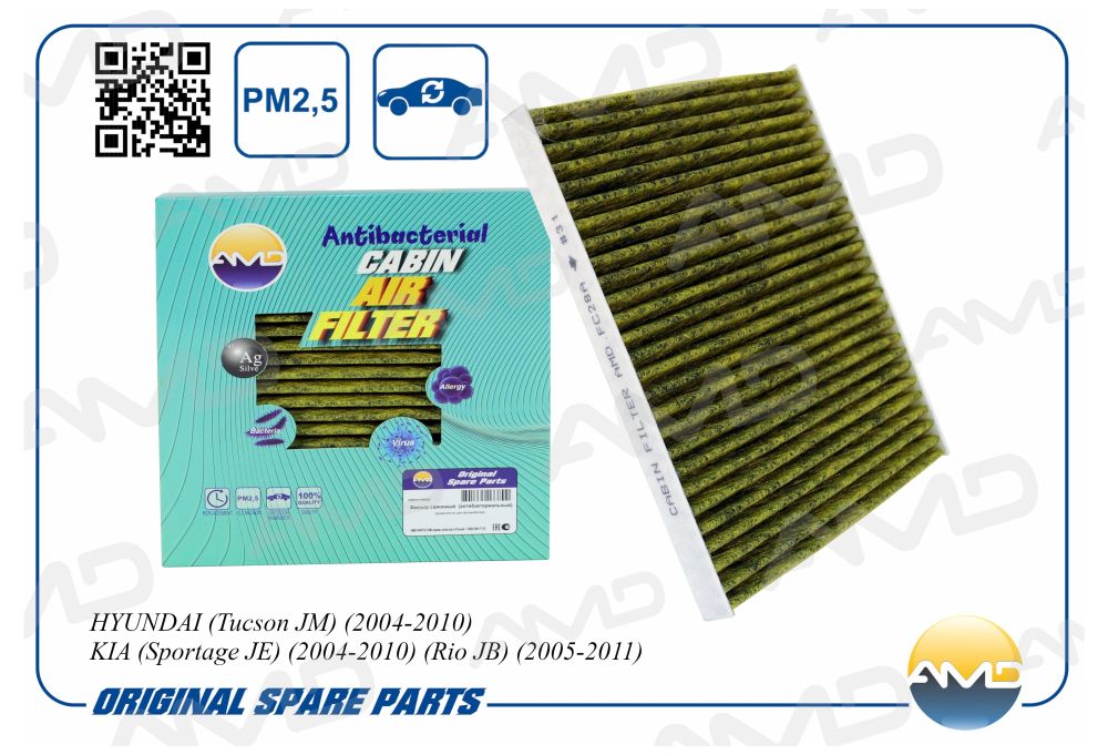 Фильтр салонный (антибактериальный, угольный) HYUNDAI (Tucson JM) (2004-2010) KIA (Sportage JE) (2004-2010) (Rio JB) (2005-2011) AMDFC28A