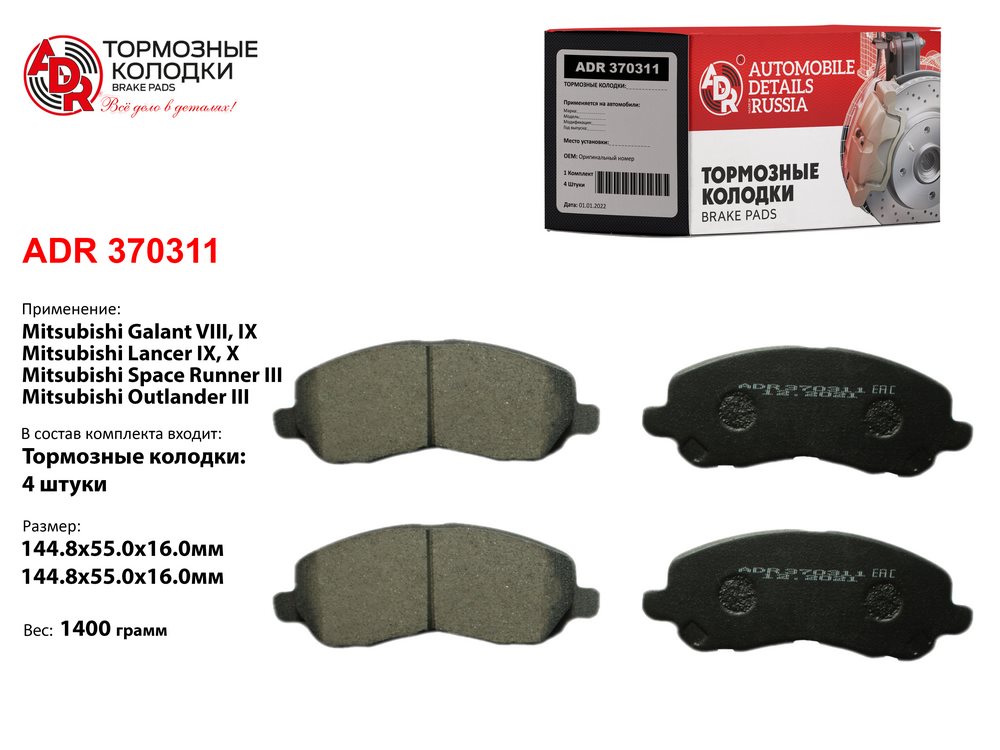 Наименование: Колодки тормозные Mitsubishi Lancer (CS, CY) 03-, ASX 10-, Outlander 07- передние ADR