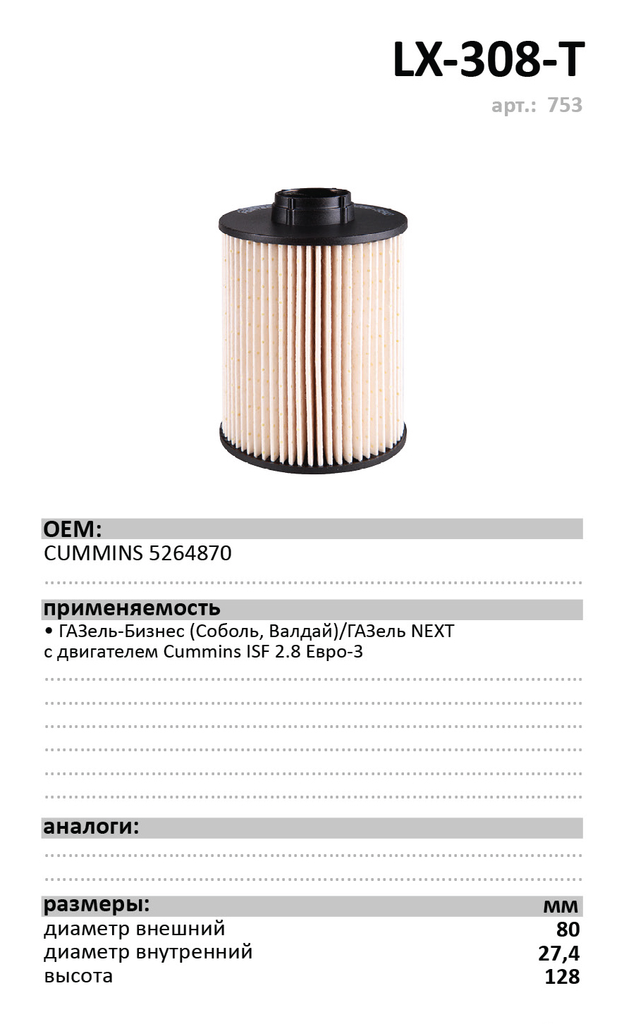 Наименование: Фильтр топливный Luxe LX-308-T ГАЗель-Бизнес двигатель Cummins ISF 2.8 (Евро-3) Россия 1/24 шт.