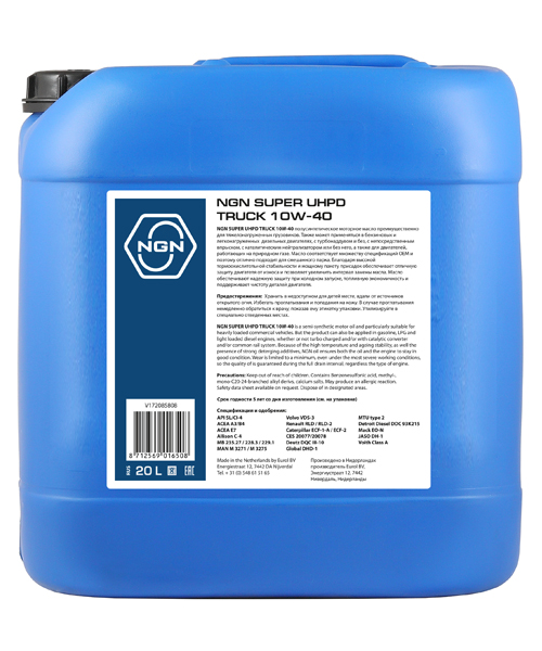 Наименование: Масло моторное NGN 10W40 CI-4/SL SUPER UHPD TRUCK полусинтетическое 20л.