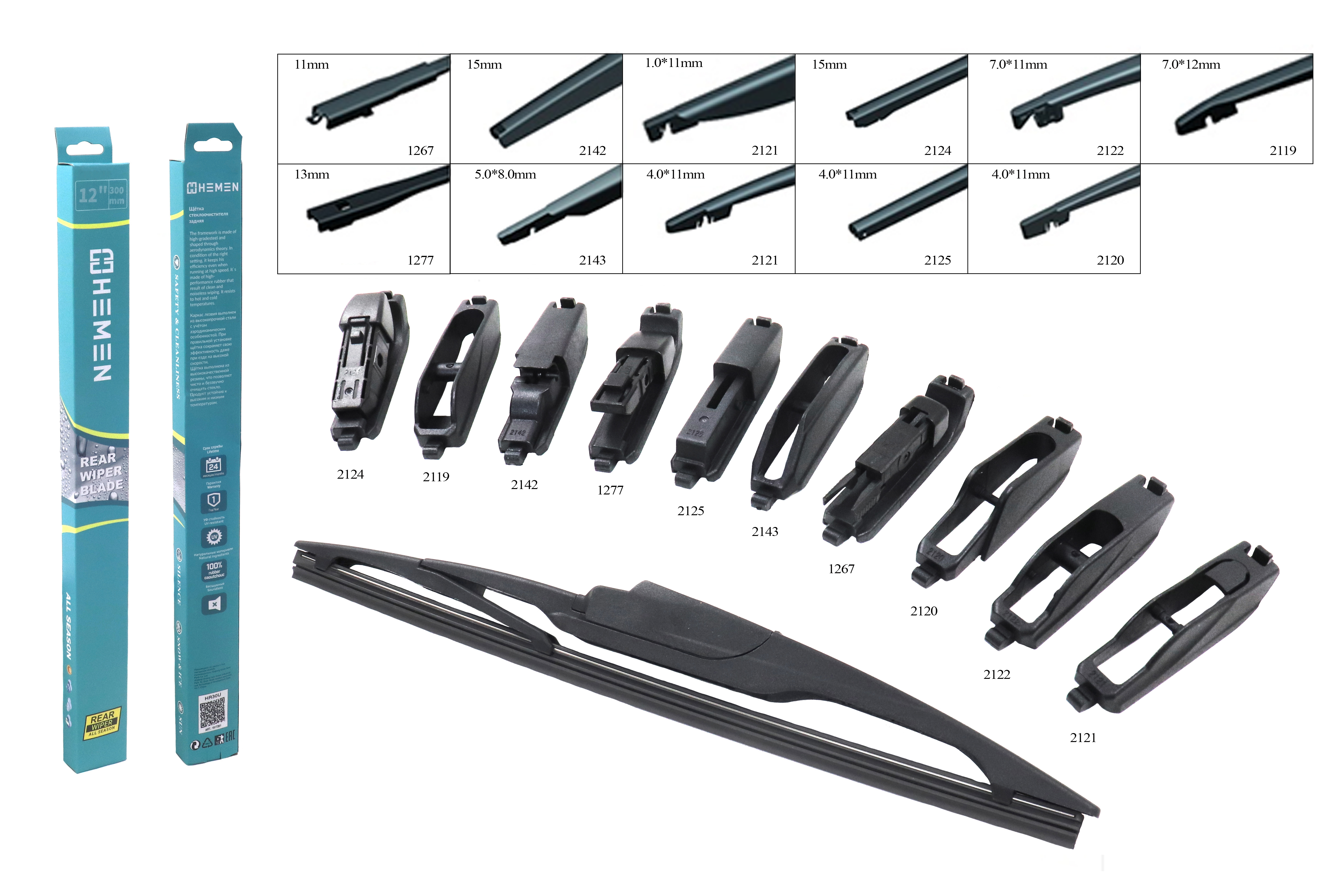 Щётка стеклоочистителя задняя HEMEN 300 мм + 9 адаптеров (HR30U)