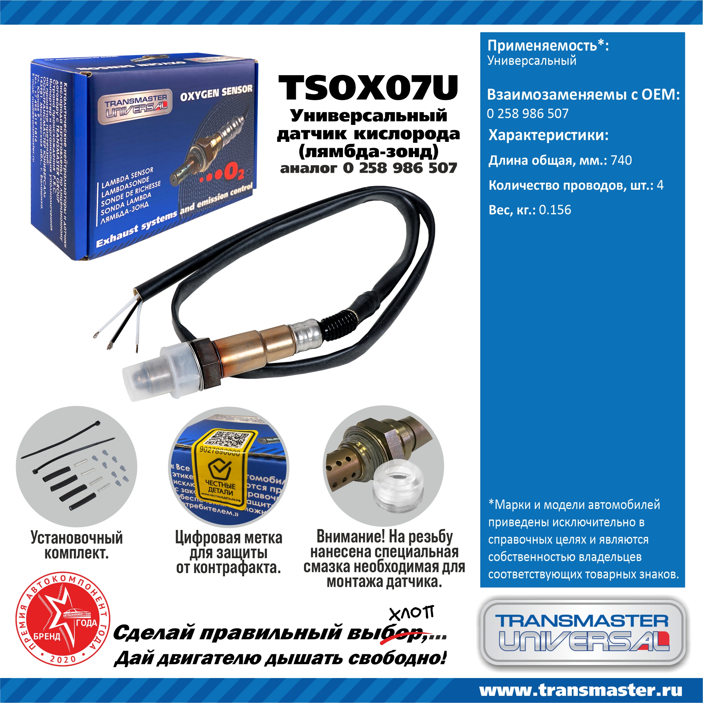 Наименование: Датчик кислородный (лямбда-зонд) TRANSMASTER UNIVERSAL TSOX07U