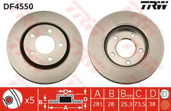 Наименование: Диск тормозной передний DODGE CARAVAN/CHRYSLER VOYAGER 00-> /VENT.D=281MM TRW DF4550