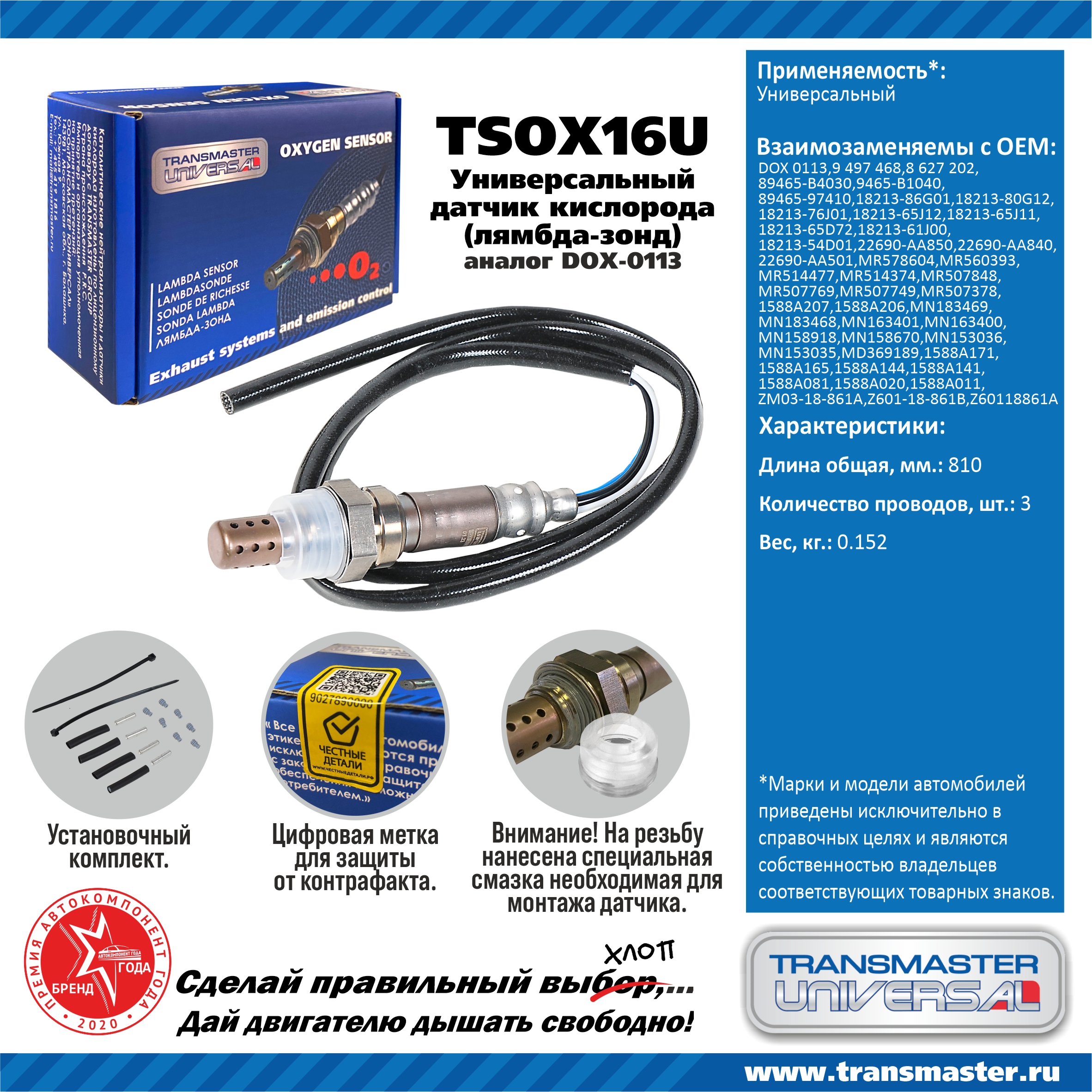 Наименование:Датчик кислородный (лямбда-зонд) TRANSMASTER UNIVERSAL TSOX16U