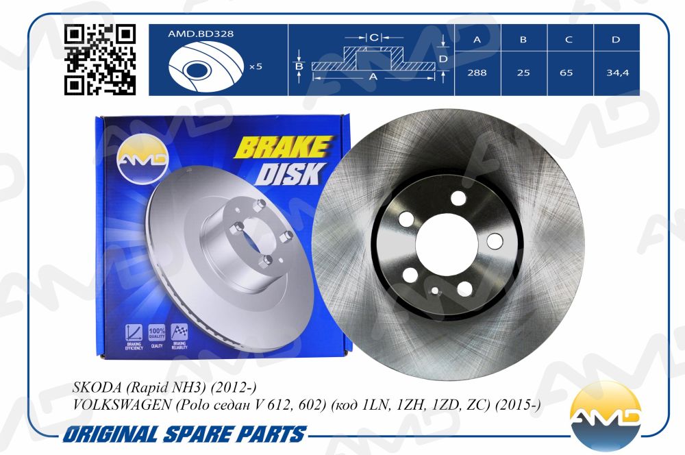 Диск тормозной передний (288 мм) SKODA Rapid NH3, 2012-, VOLKSWAGEN Polo седан V 612, 602, код 1LN, 1ZH, 1ZD, ZC, 2015-, 288 мм AMDBD328