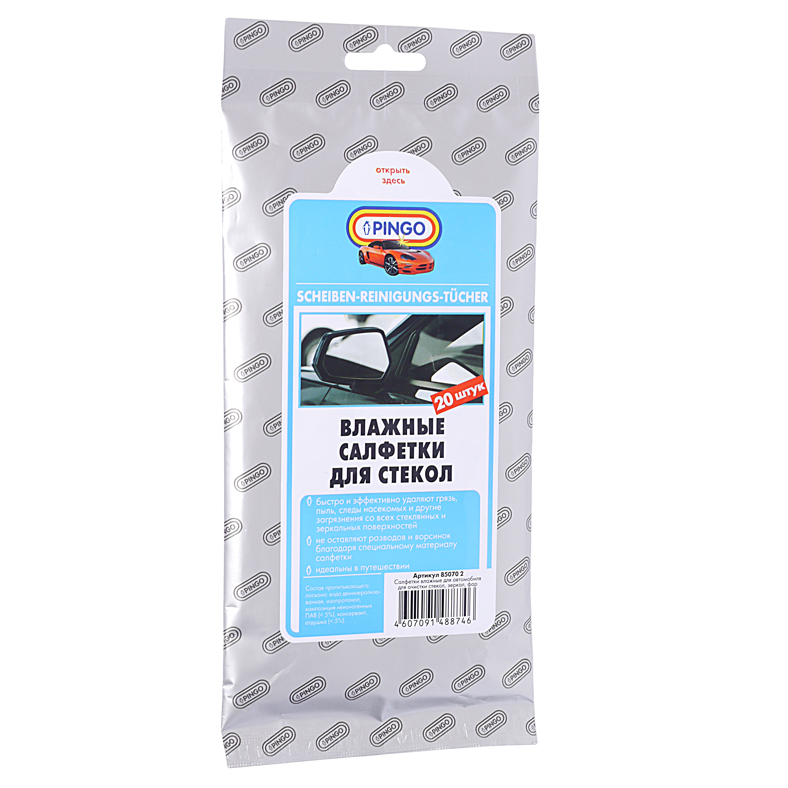 Наименование:Салфетка влажная для очистки стекол 20x16см в мягкой упаковке 20шт. PINGO